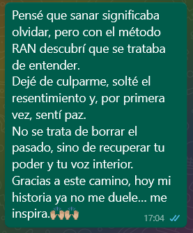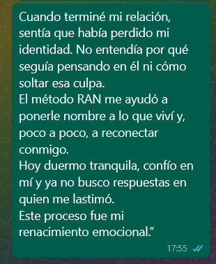 Por eso creé RENACER y el método RAN (Recuperación Después del Abuso Narcisista), una guía donde plasme todo lo que me hubiese gustado tener cuando estaba en ese abismo emocional, una guía terapéutica y amorosa que ya ha ayudado a cientos de mujeres a sanar, recuperar su poder y volver a elegirse.
